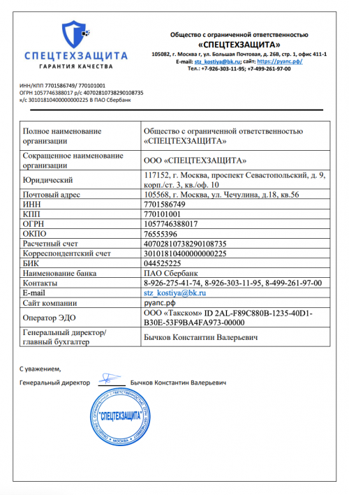 | Полное наименование организации | Общество с ограниченной ответственностью «СПЕЦТЕХЗАЩИТА» |